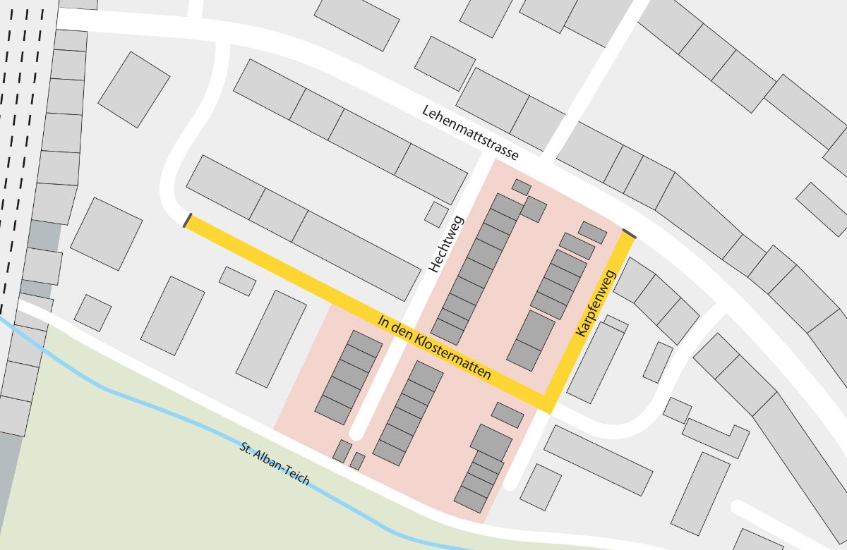 Die Reiheneinfamilienhäuser am Karpfenweg und am Hechtweg können an das Wärmenetz angebunden werden. Voraussetzung ist, dass gebäudeinterne Durchleitungen eingerichtet werden können: Die Hausanschlussleitung wird in das Kellergeschoss einer Liegenschaft eingeführt und über Kernbohrungen in die angrenzenden Kellerräume weitergeführt. Dieses Vorgehen ermöglicht eine effiziente, platzsparende und quartierschonende Erschliessung der Häuserzeilen.